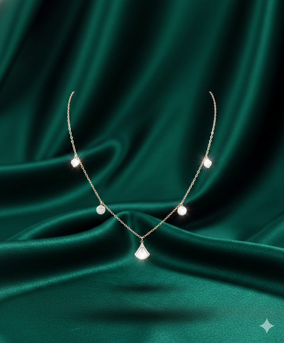 Accompanying the central motif are four circular charms, each encrusted with premium diamonds that catch the light with every gesture. The architectural fan design offers a modern, sophisticated silhouette, making it an ideal statement piece for gala evenings or a luxurious accent for formal events. Handcrafted for the woman who appreciates intricate artisanal detail, this necklace is a timeless celebration of grace and contemporary luxury.