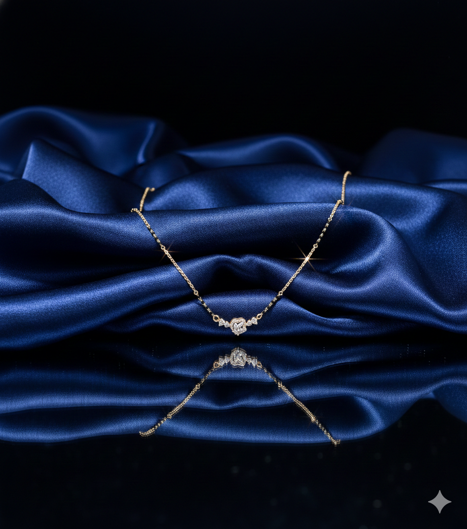Celebrate the blossoming of a lifelong journey with the Floral Harmony Mangalsutra, a piece that beautifully reimagines traditional heritage with a touch of botanical grace. This exquisite necklace features a fine 14k rose gold chain, delicately interspersed with classic black beads that signify the sacred protection of marriage. The central pendant is a masterfully crafted floral motif, featuring a brilliant-cut diamond heart at its core, flanked by shimmering pear-shaped diamond accents that mimic delicate leaves. Each stone is hand-set to maximize its natural fire, creating a radiant focal point that is both feminine and sophisticated. Perfectly balanced for the modern bride, this Mangalsutra offers a lightweight and versatile design that honors tradition while seamlessly complementing contemporary style.