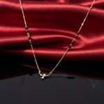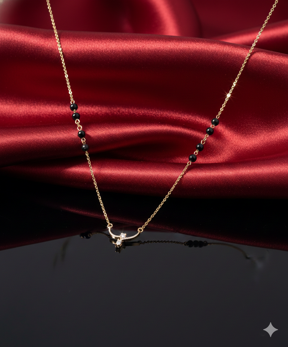 Celebrate the delicate harmony of your sacred union with the Graceful Duo Mangalsutra, a piece that offers a poetic and minimalist take on traditional heritage. This exquisite necklace features a fine 14k rose gold chain, subtly accented with classic black beads that serve as a timeless symbol of marital protection. The focal point is a slender, curved gold bar that elegantly suspends two brilliant-cut diamonds of differing sizes. This staggered duo creates a rhythmic play of light and movement, representing the unique partnership of two souls. Handcrafted for the modern woman who appreciates understated luxury, its lightweight and versatile silhouette makes it the perfect signature piece for daily elegance and special milestones alike.