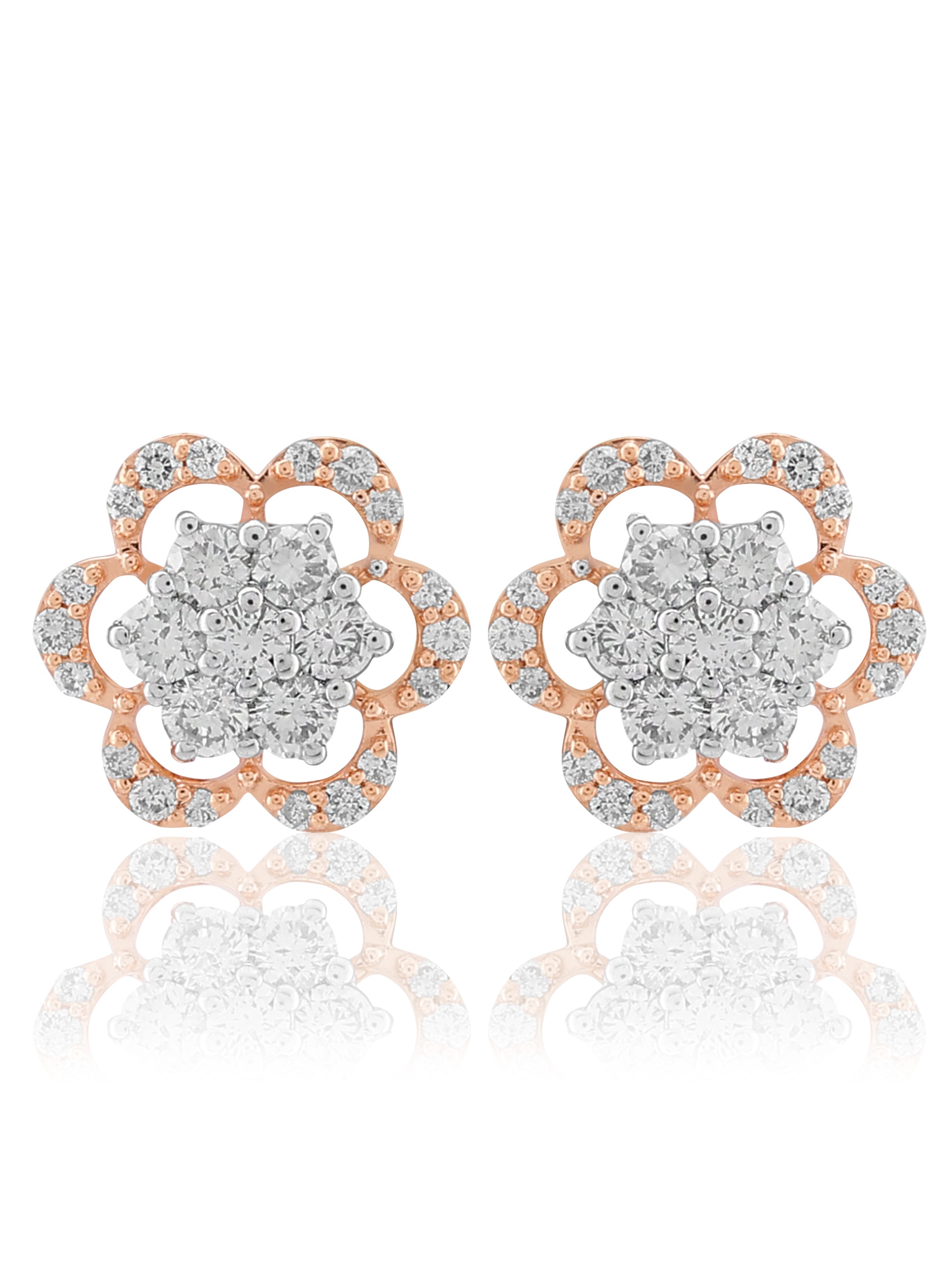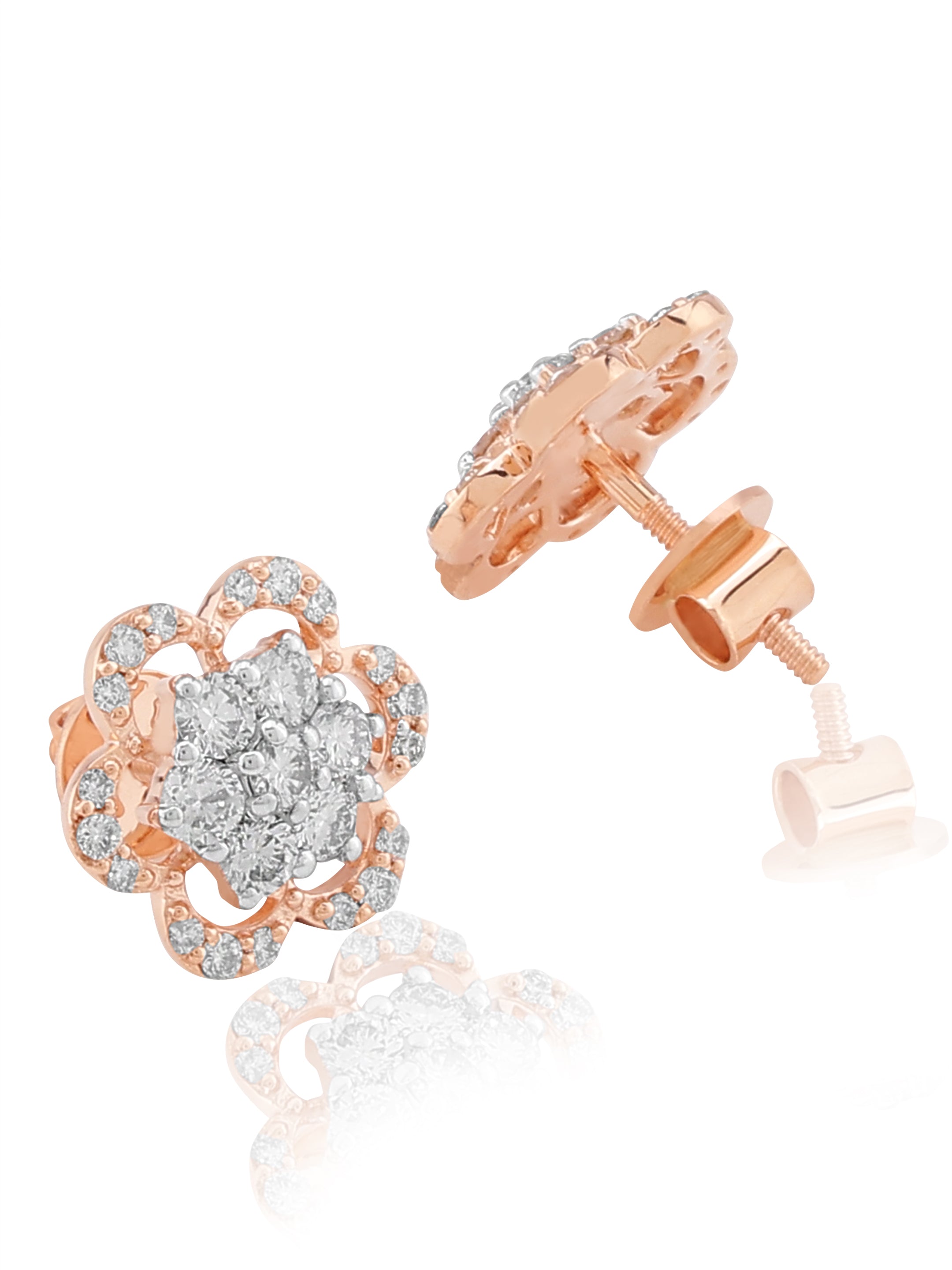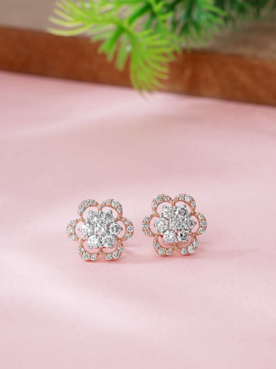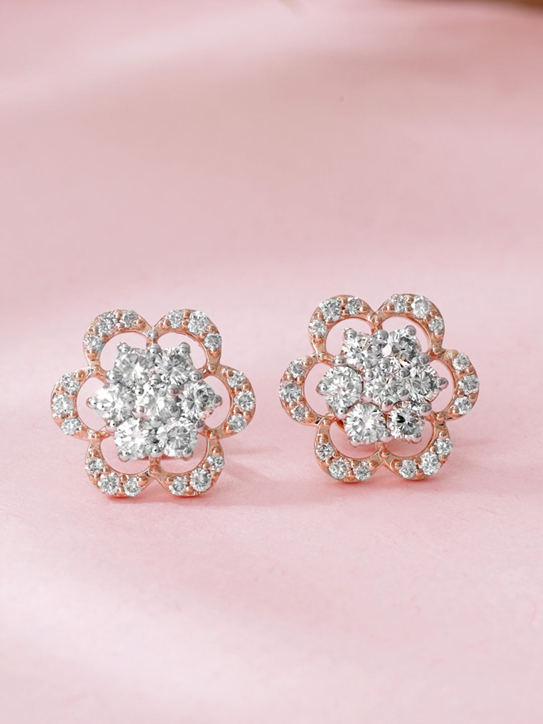 The Melora Rosaline Diamond Earrings are a stunning example of floral elegance and modern luxury. Crafted in luxurious rose gold, each earring features a captivating floral design, where petals are intricately formed with dazzling diamonds. The layered arrangement of the petals creates a three-dimensional effect, giving the earrings a dynamic and radiant sparkle from every angle. The warmth of the rose gold complements the brilliance of the diamonds, creating a harmonious blend of color and light. Perfect for special occasions or adding a touch of glamour to your everyday look, these earrings are a timeless addition to any jewelry collection.