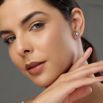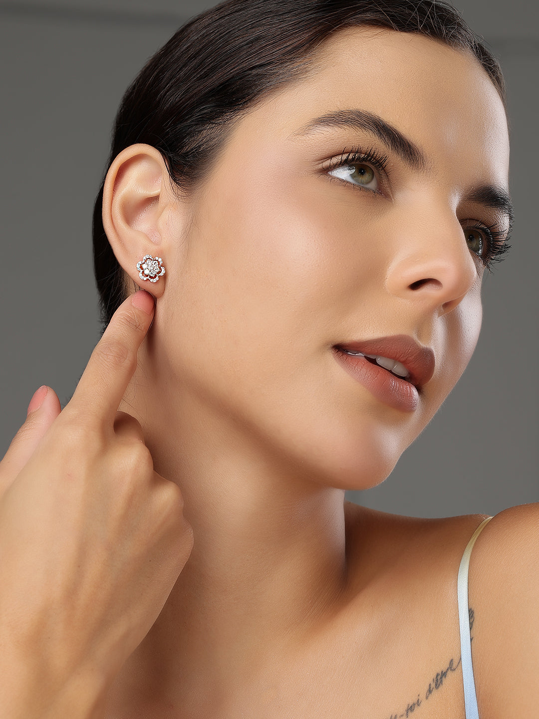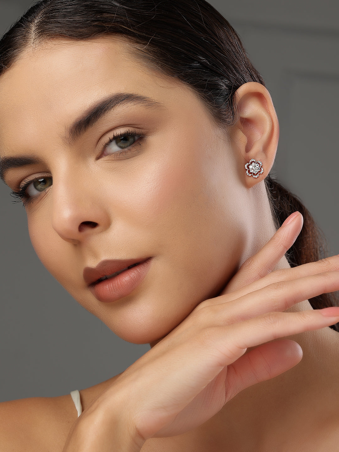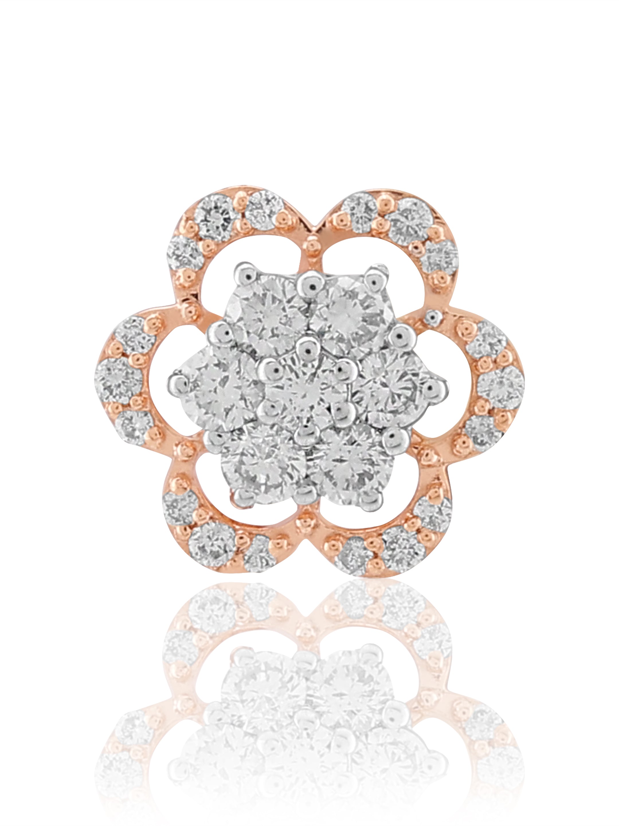 The Melora Rosaline Diamond Earrings are a stunning example of floral elegance and modern luxury. Crafted in luxurious rose gold, each earring features a captivating floral design, where petals are intricately formed with dazzling diamonds. The layered arrangement of the petals creates a three-dimensional effect, giving the earrings a dynamic and radiant sparkle from every angle. The warmth of the rose gold complements the brilliance of the diamonds, creating a harmonious blend of color and light. Perfect for special occasions or adding a touch of glamour to your everyday look, these earrings are a timeless addition to any jewelry collection.