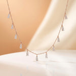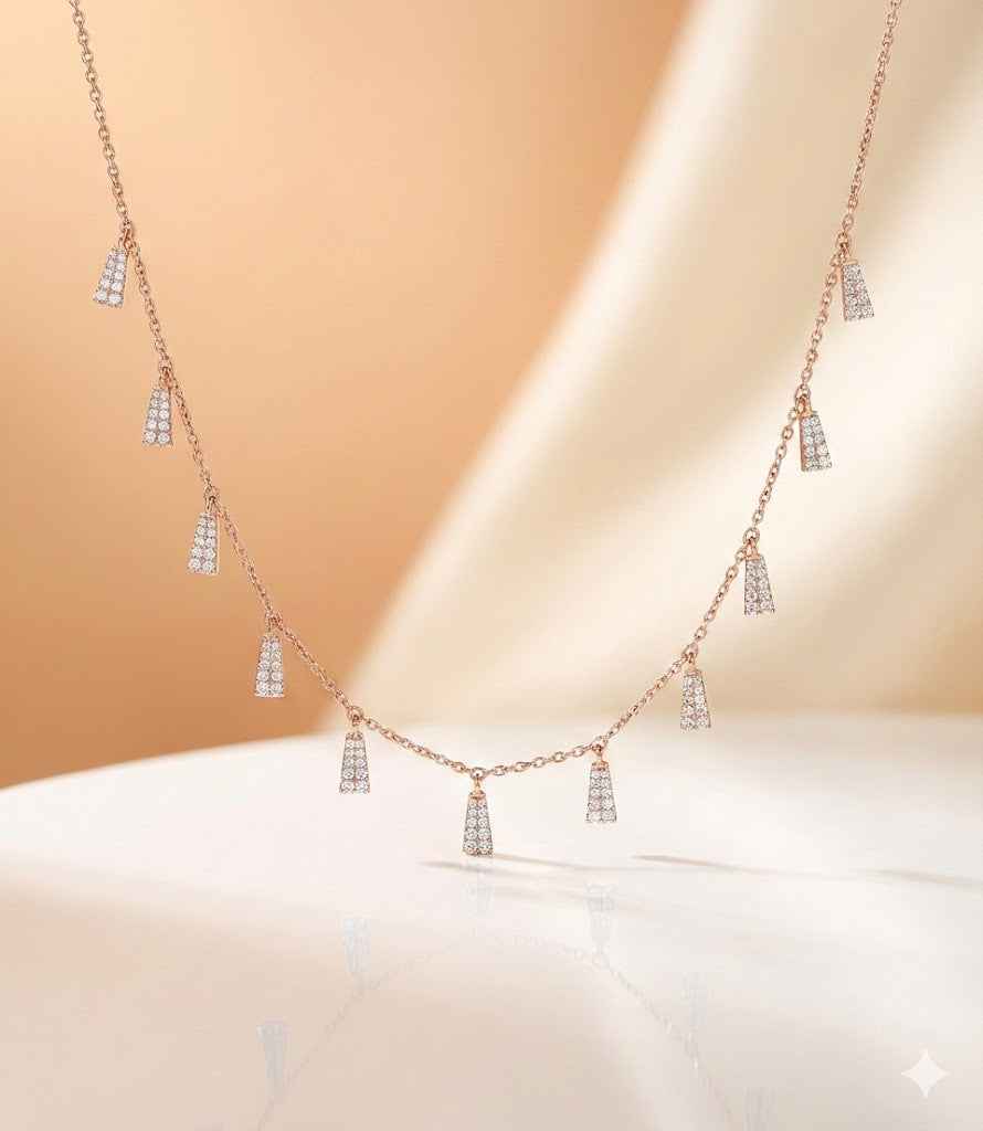 The Prism Cascade Necklace is a celebration of rhythmic brilliance. This stunning piece features a delicate 14k gold chain adorned with a series of suspended trapezoidal charms, each meticulously paved with shimmering diamonds. The linear, geometric shape of the drops offers a modern take on the classic fringe necklace, creating a "shimmering curtain" effect along the neckline.