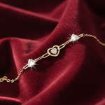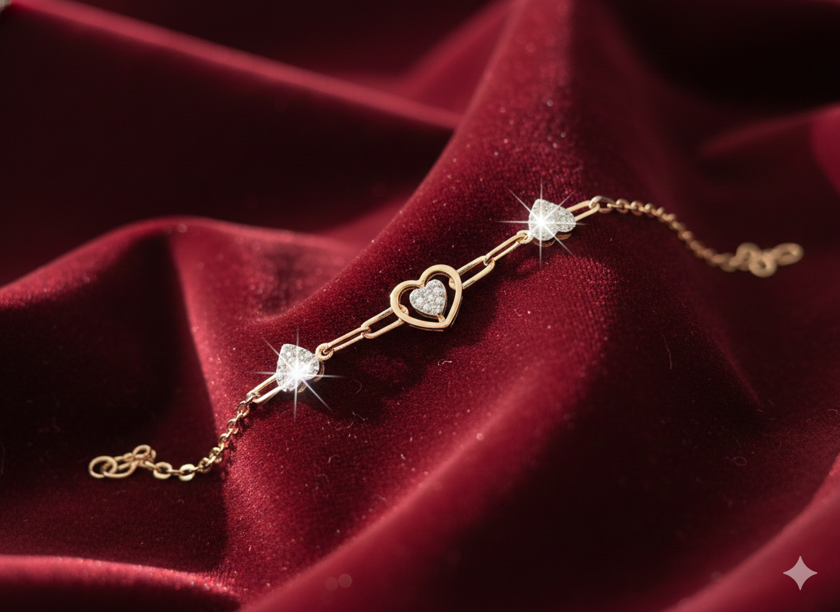 Celebrate the rhythmic beauty of love with the Triple Heart Symphony Bracelet, a delicate masterpiece of romantic design.this exquisite piece is handcrafted in warm 14k rose gold, featuring a graceful paperclip-style link chain that provides a modern, airy aesthetic.The bracelet is adorned with three shimmering heart motifs: a central open-work rose gold heart framed by two brilliant, pavé-set diamond hearts.Each diamond-encrusted heart is designed to capture and reflect light with every movement, creating a constant, sophisticated sparkle.With its lightweight feel and symbolic silhouette, this bracelet serves as a perfect daily signature or a deeply meaningful gift for someone who holds your heart.