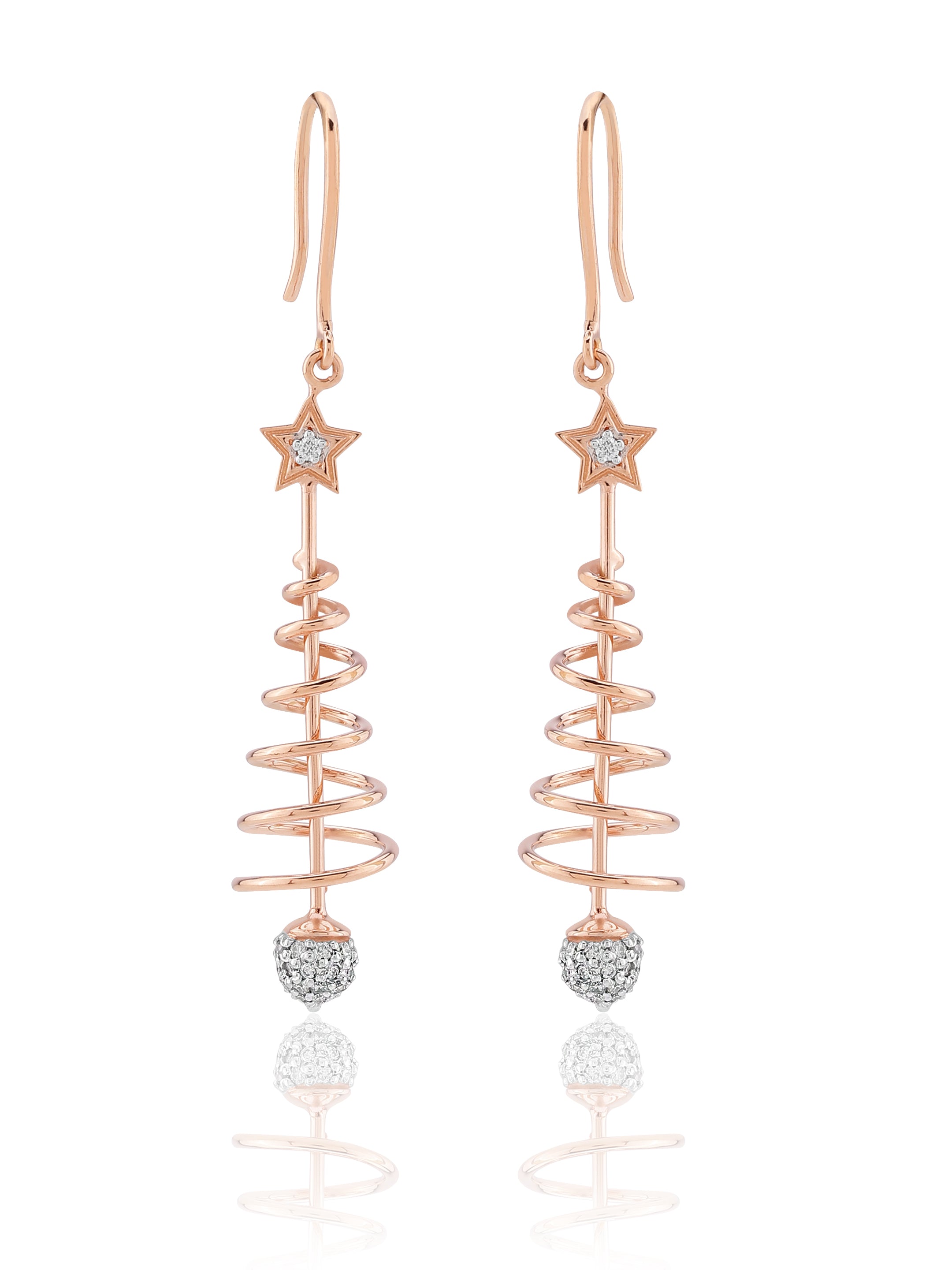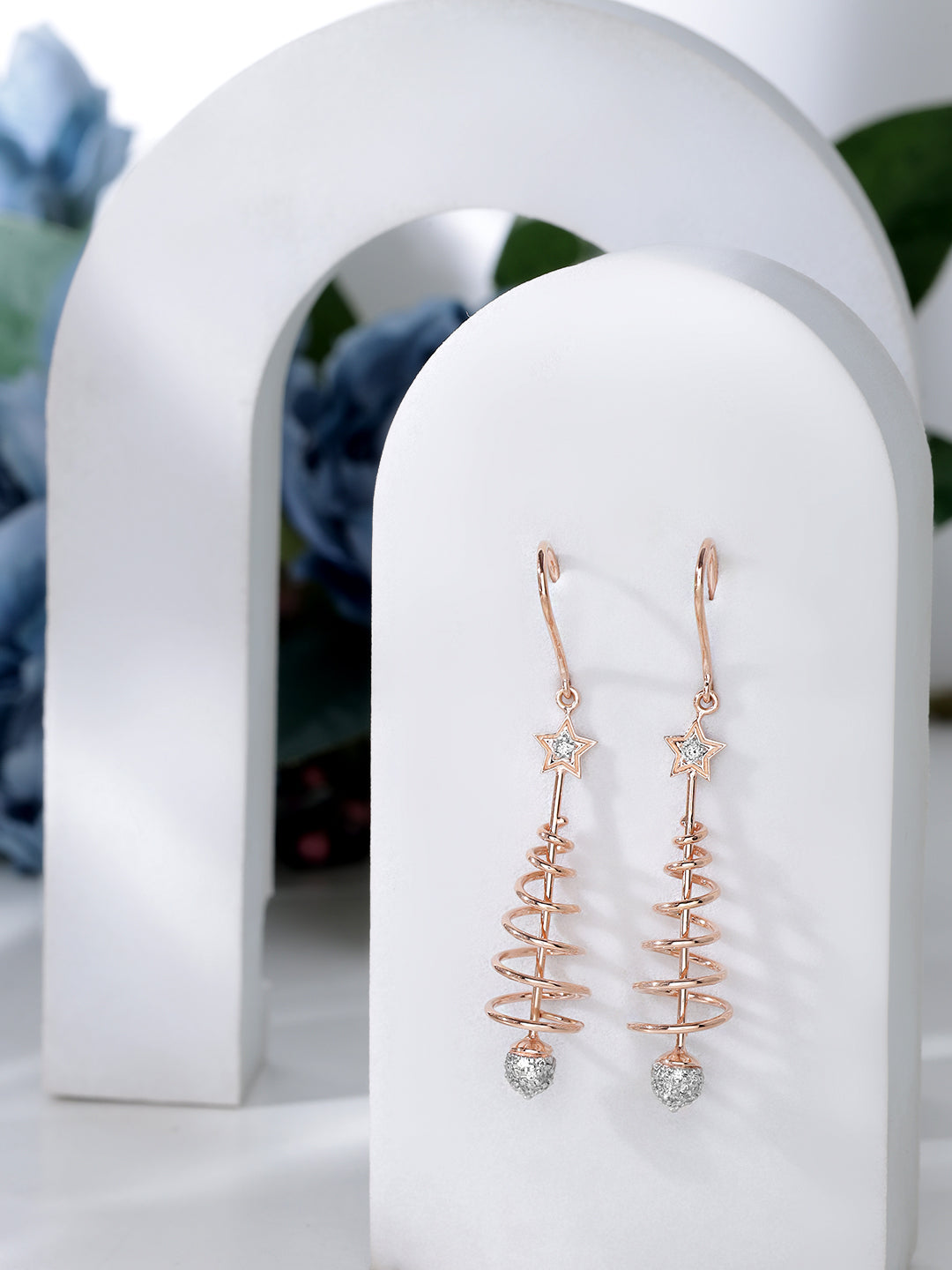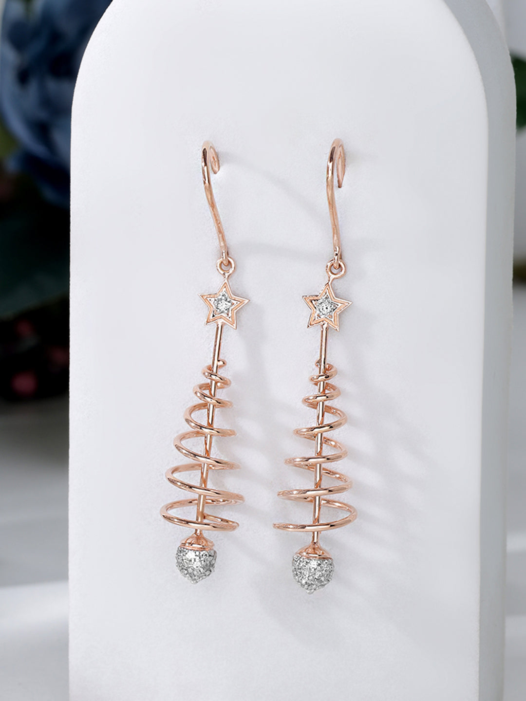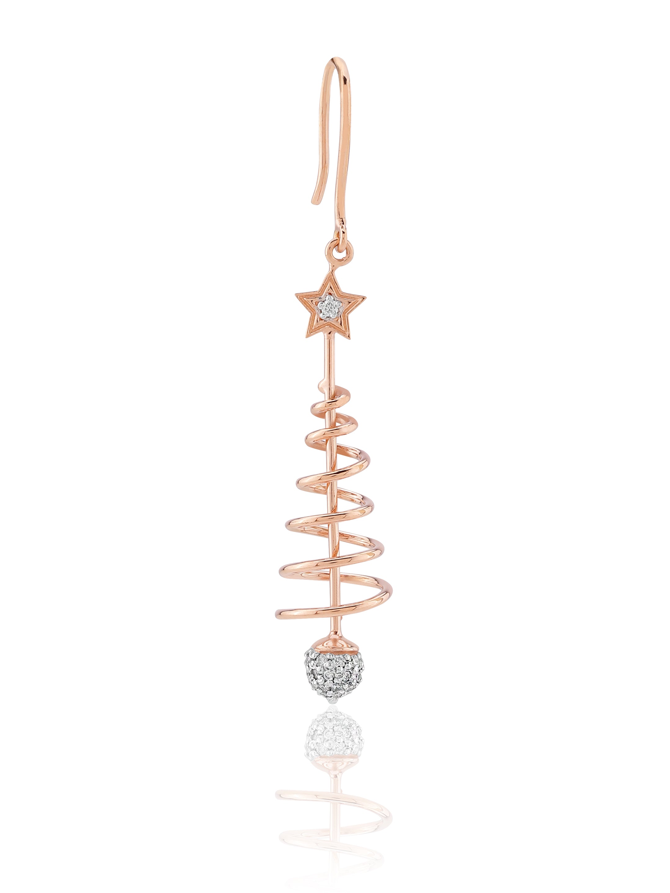 Celebrate the holiday season with the enchanting Twinkling Treetop Spiral Diamond Earrings, a design inspired by the timeless beauty of a Christmas tree. Each earring begins with a radiant star, symbolizing the magic of the festive season, perfectly set atop the design. The star guides your gaze downward along a graceful spiral that echoes the winding garlands and twinkling lights draped around a holiday tree. The spiral culminates in a glittering orb, encrusted with brilliant diamonds, reminiscent of a cherished ornament. Crafted in luxurious rose gold, these earrings exude warmth and elegance, making them a perfect accessory for the festive season. The gentle swirl of the spiral adds a touch of movement and fluidity, while the diamond-studded sphere at the base sparkles with every turn.