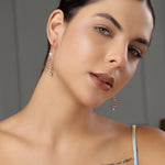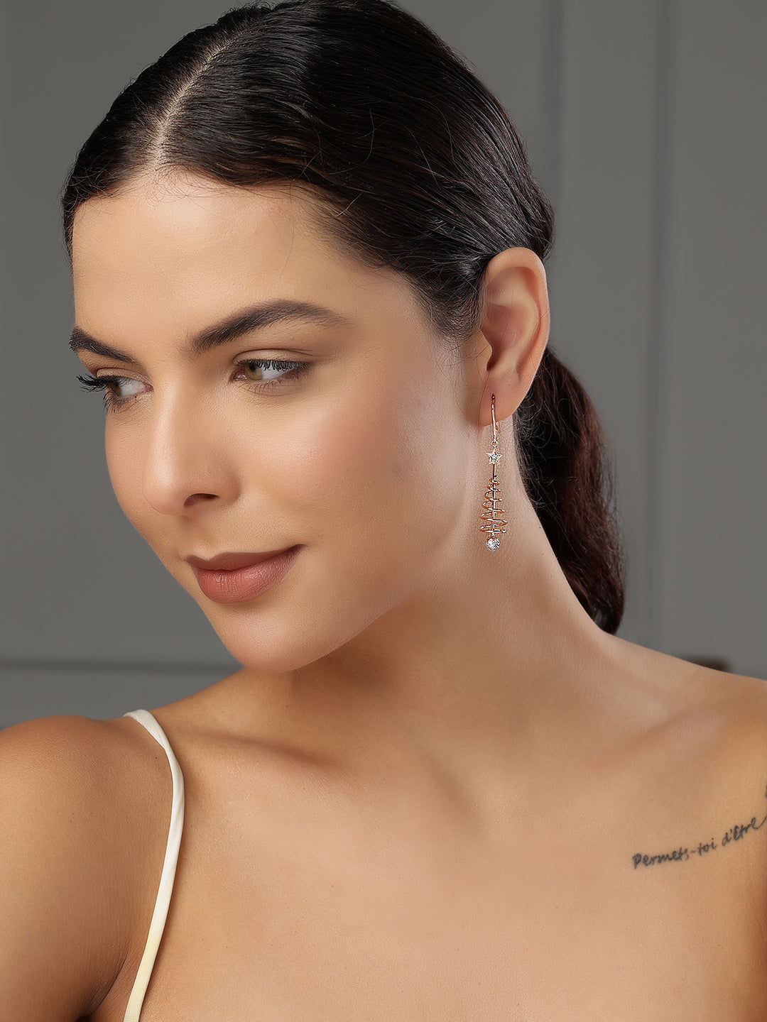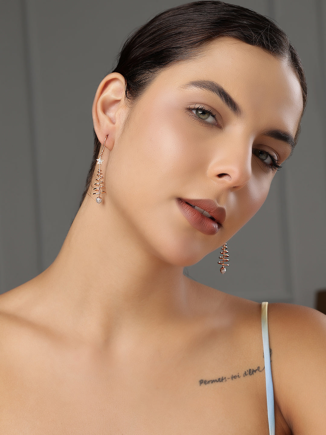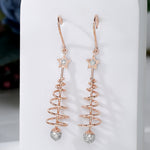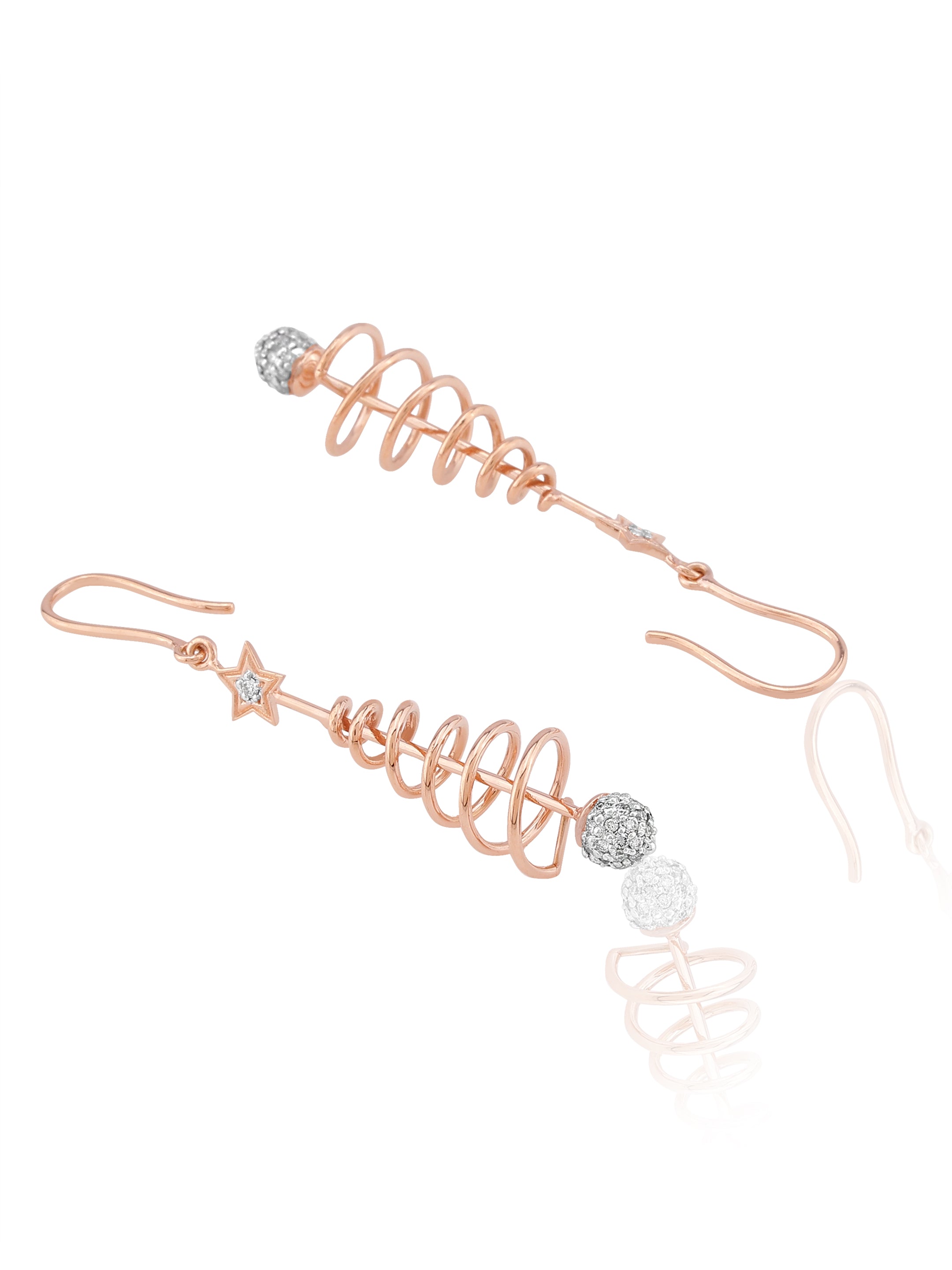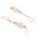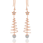 Celebrate the holiday season with the enchanting Twinkling Treetop Spiral Diamond Earrings, a design inspired by the timeless beauty of a Christmas tree. Each earring begins with a radiant star, symbolizing the magic of the festive season, perfectly set atop the design. The star guides your gaze downward along a graceful spiral that echoes the winding garlands and twinkling lights draped around a holiday tree. The spiral culminates in a glittering orb, encrusted with brilliant diamonds, reminiscent of a cherished ornament. Crafted in luxurious rose gold, these earrings exude warmth and elegance, making them a perfect accessory for the festive season. The gentle swirl of the spiral adds a touch of movement and fluidity, while the diamond-studded sphere at the base sparkles with every turn.