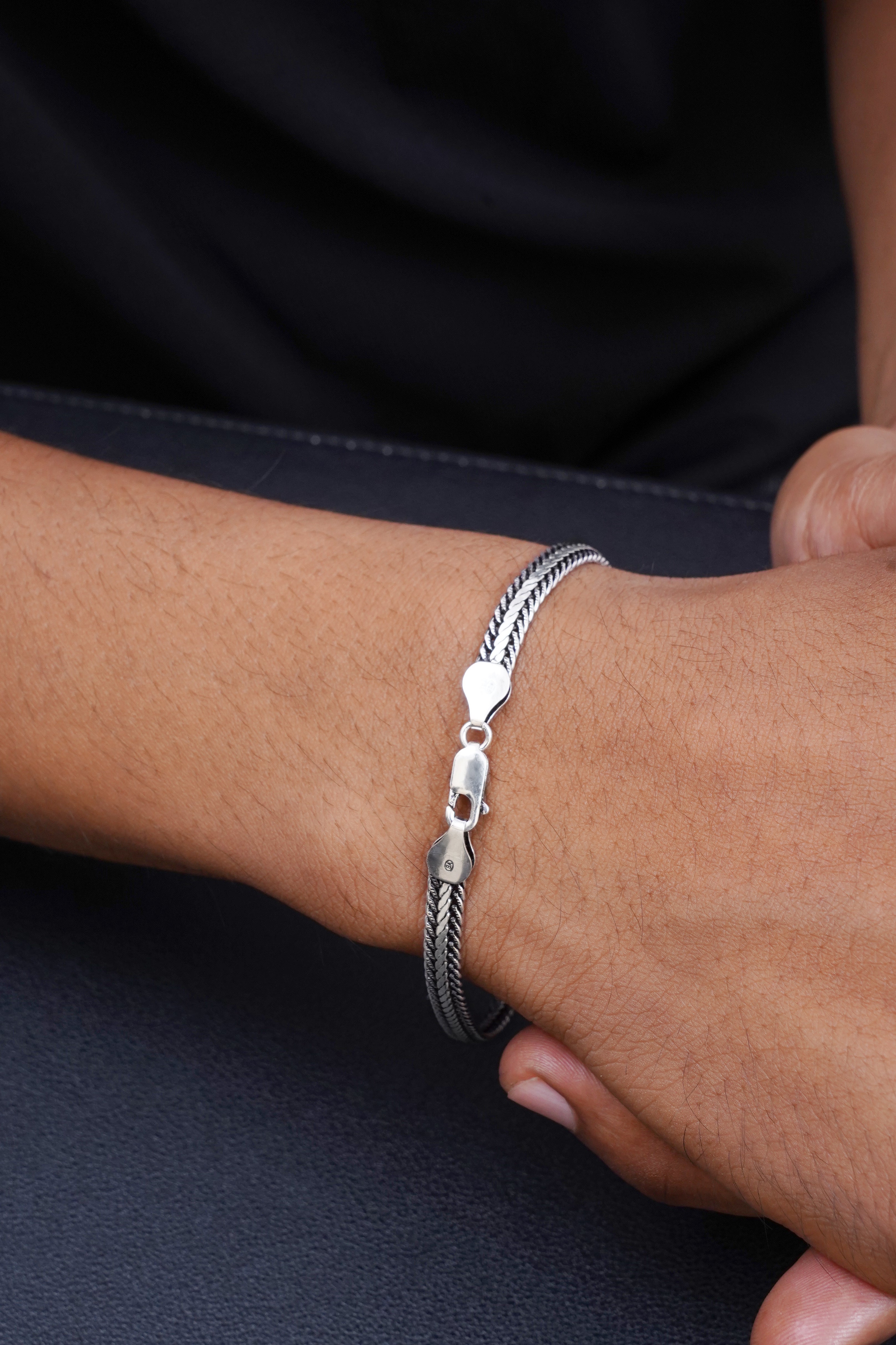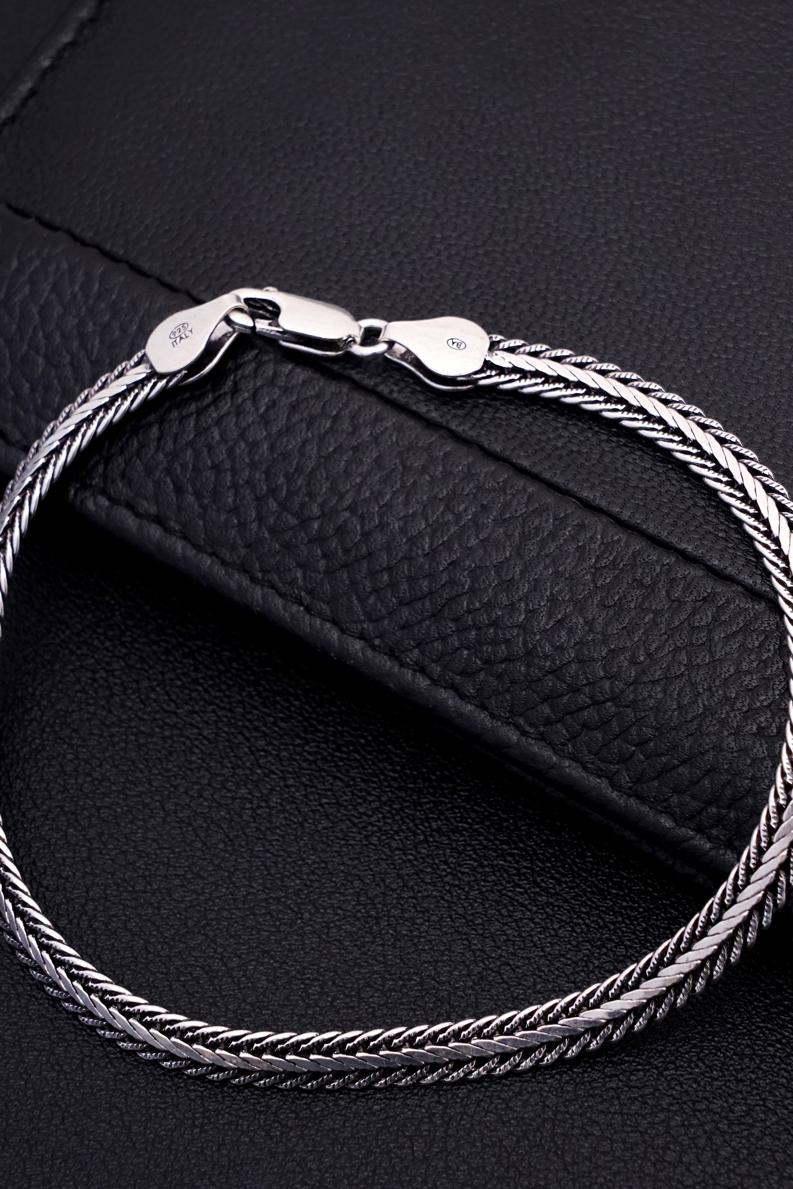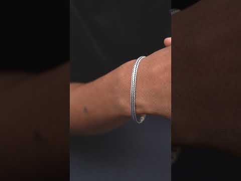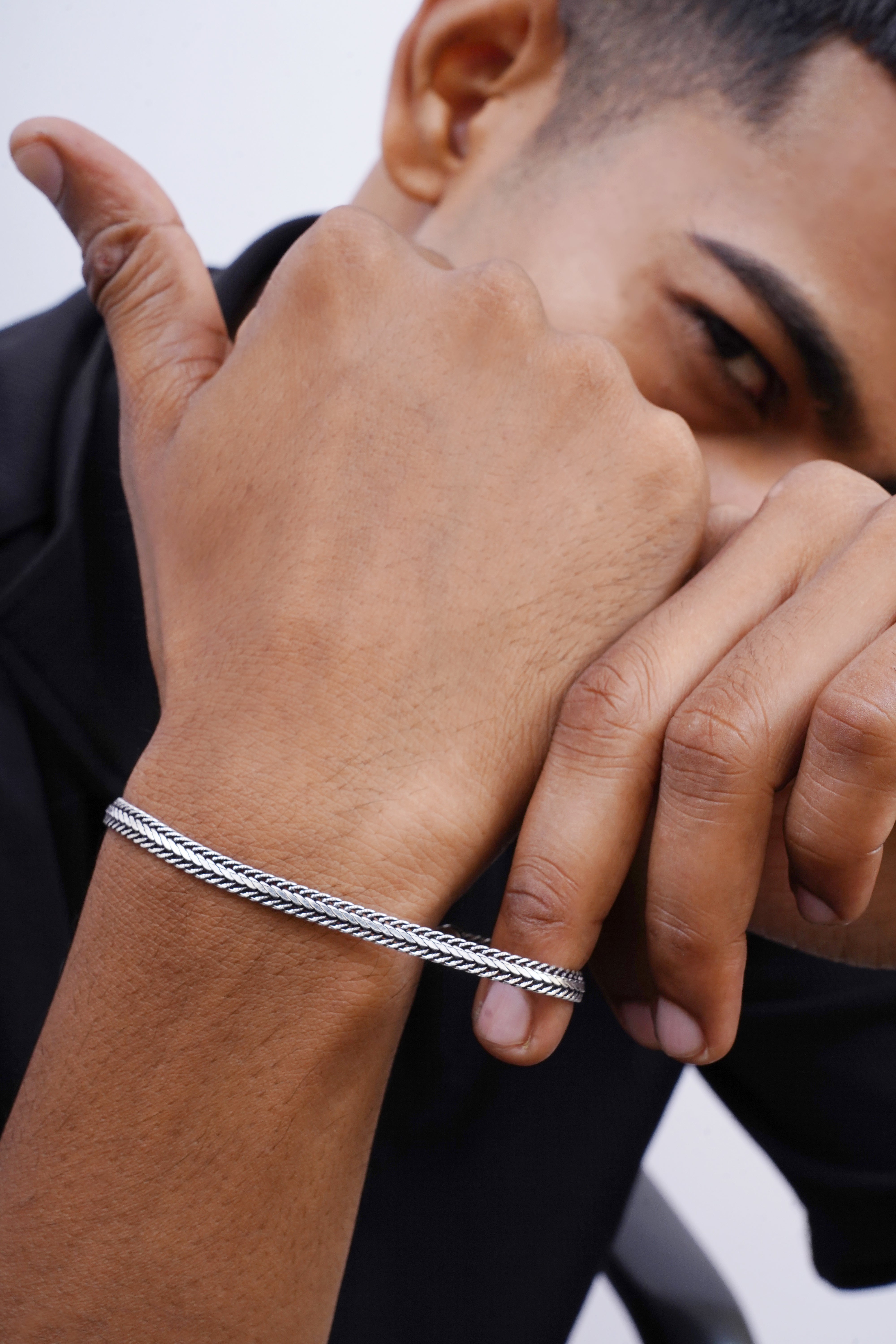 This Vortex Braided Chain Men's Silver Bracelet with rhodium plating is crafted with an intricately woven rope-style chain, creating a unique blend of elegance and strength. The twisted helix-like design enhances texture and depth, making it a standout piece for modern men. The bracelet's high-polish rhodium finish provides a lustrous, anti-tarnish surface that ensures durability. Its sleek clasp mechanism seamlessly integrates with the design, offering both security and sophistication. Whether worn solo or layered, this bracelet embodies a timeless appeal suitable for casual and formal looks alike.