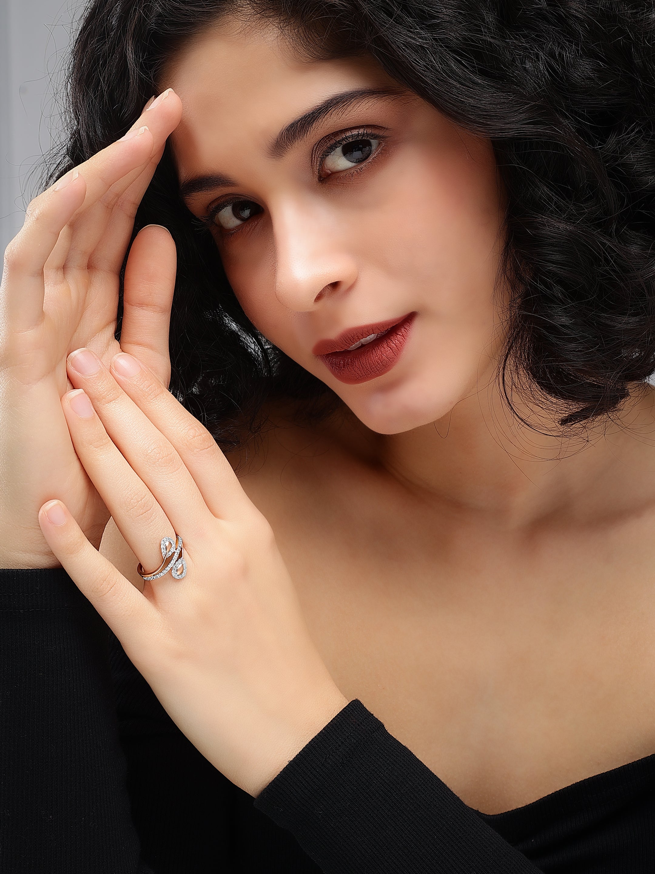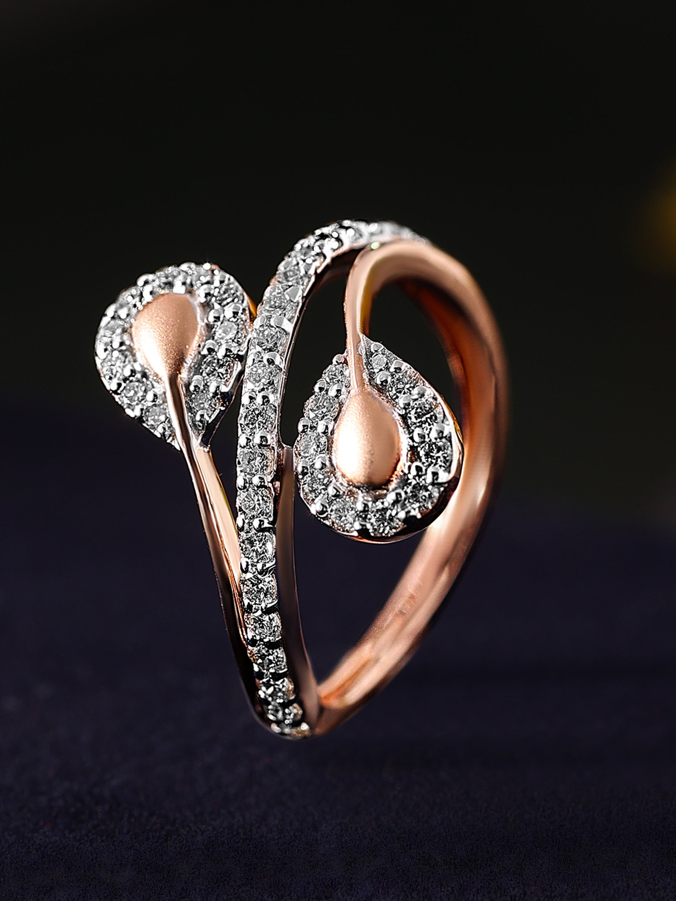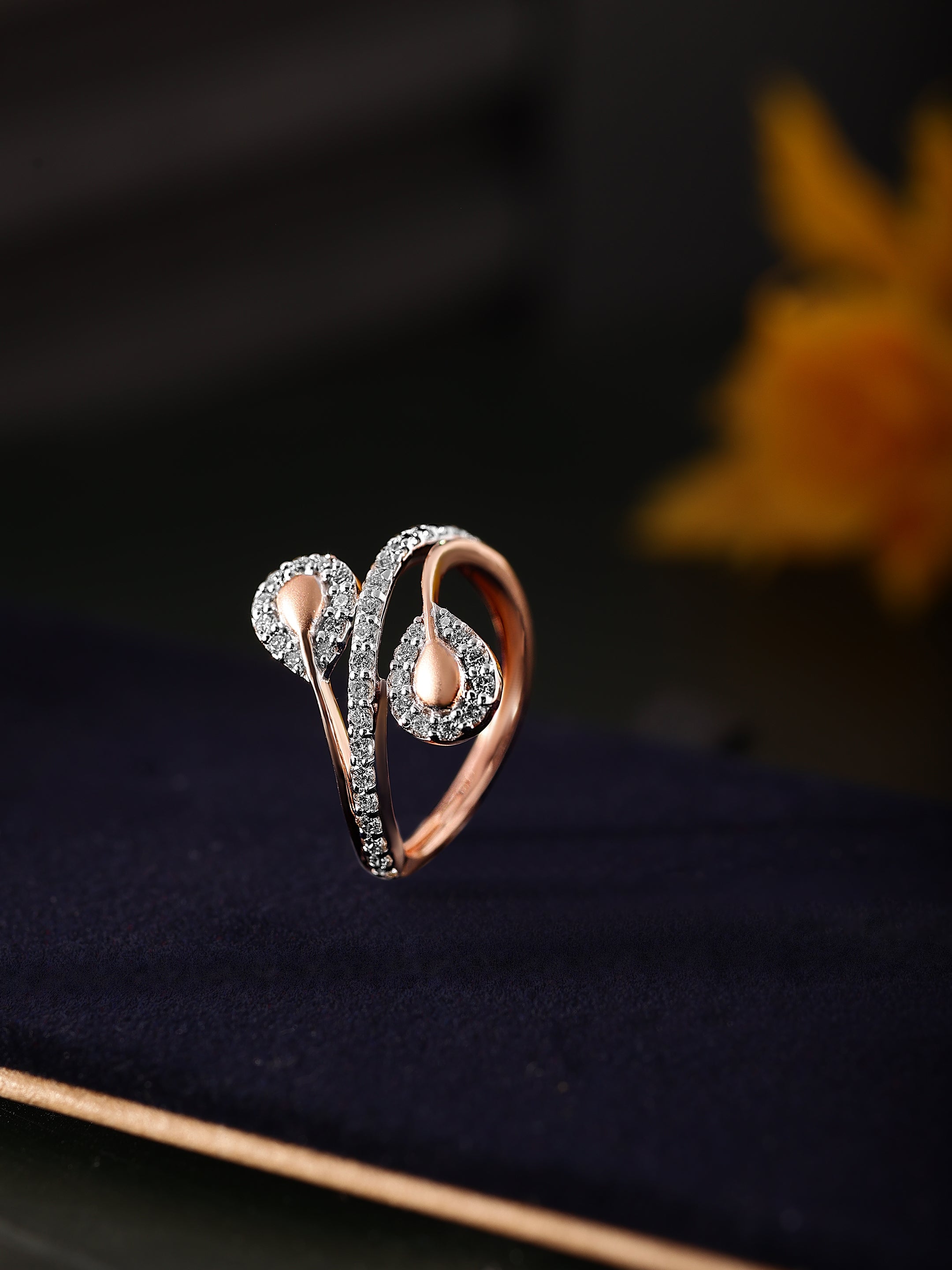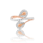 The Vortex Halo Layered Diamond Ring captures the essence of delicate elegance with its flowing, vine-like design. Crafted in luxurious rose gold, this ring features two graceful tendrils that curve and intertwine, each adorned with a halo of brilliant-cut diamonds. The tendrils culminate in teardrop-shaped tips, adding a touch of organic beauty and sophistication. The intricate design ensures that the diamonds catch and reflect light from every angle, creating a mesmerizing sparkle. This ring seamlessly blends contemporary style with timeless charm, making it a perfect statement piece for any occasion.