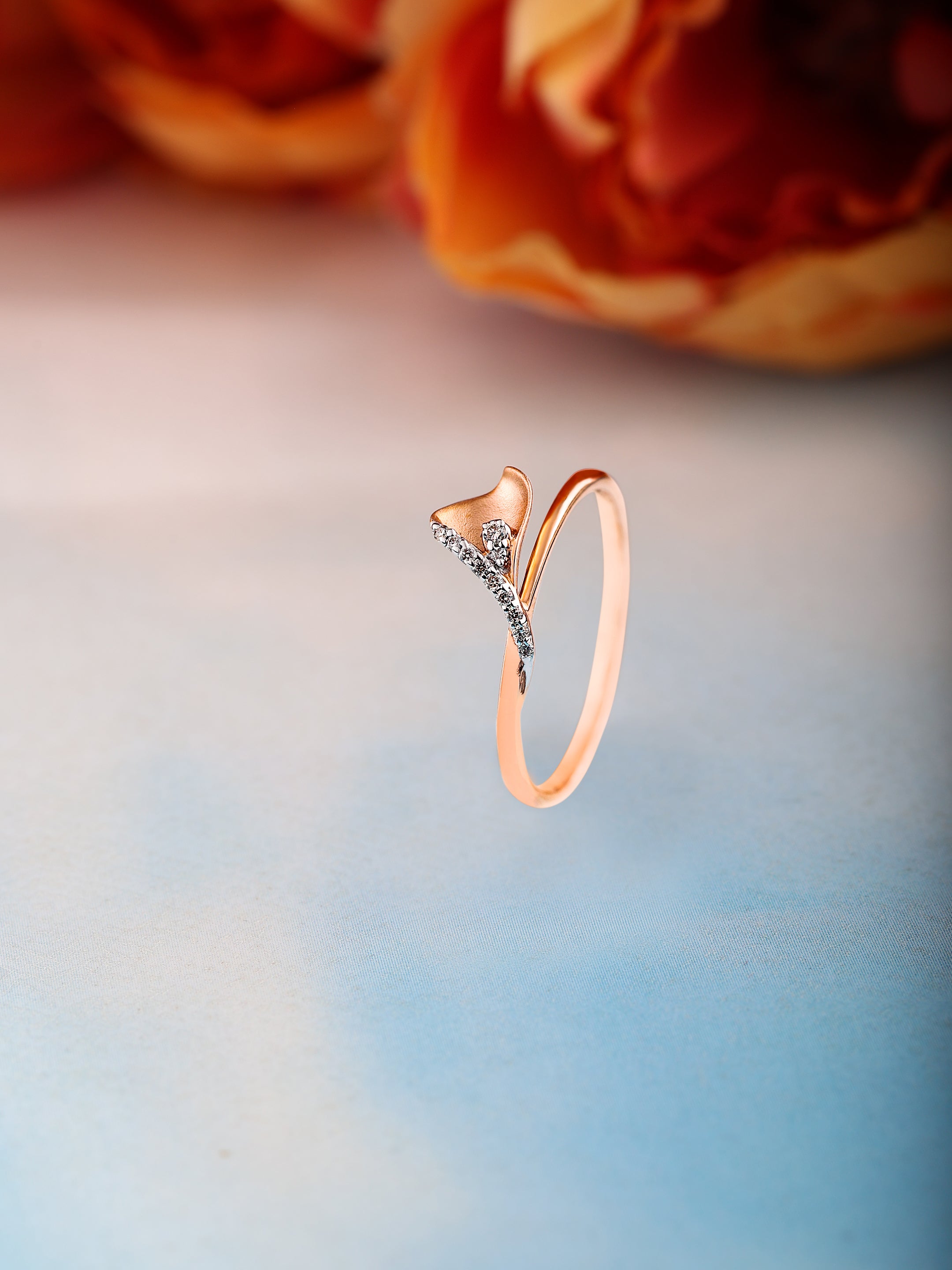 Introducing the Whimsical Petal Diamond Ring - a mesmerizing blend of elegance and grace. The Whimsical Petal Diamond Ring features a sleek rose gold band adorned with a beautiful petal-like design. The curvy petal, delicately crafted, create a sense of enchantment. The center and edges of the flower are adorned with shimmering diamonds, adding a touch of sparkle to the ring.