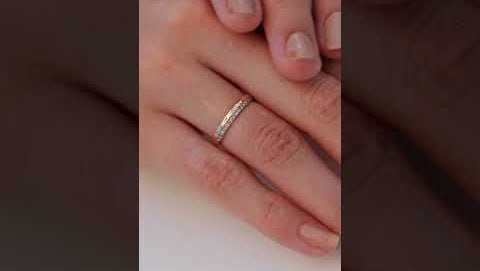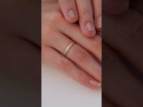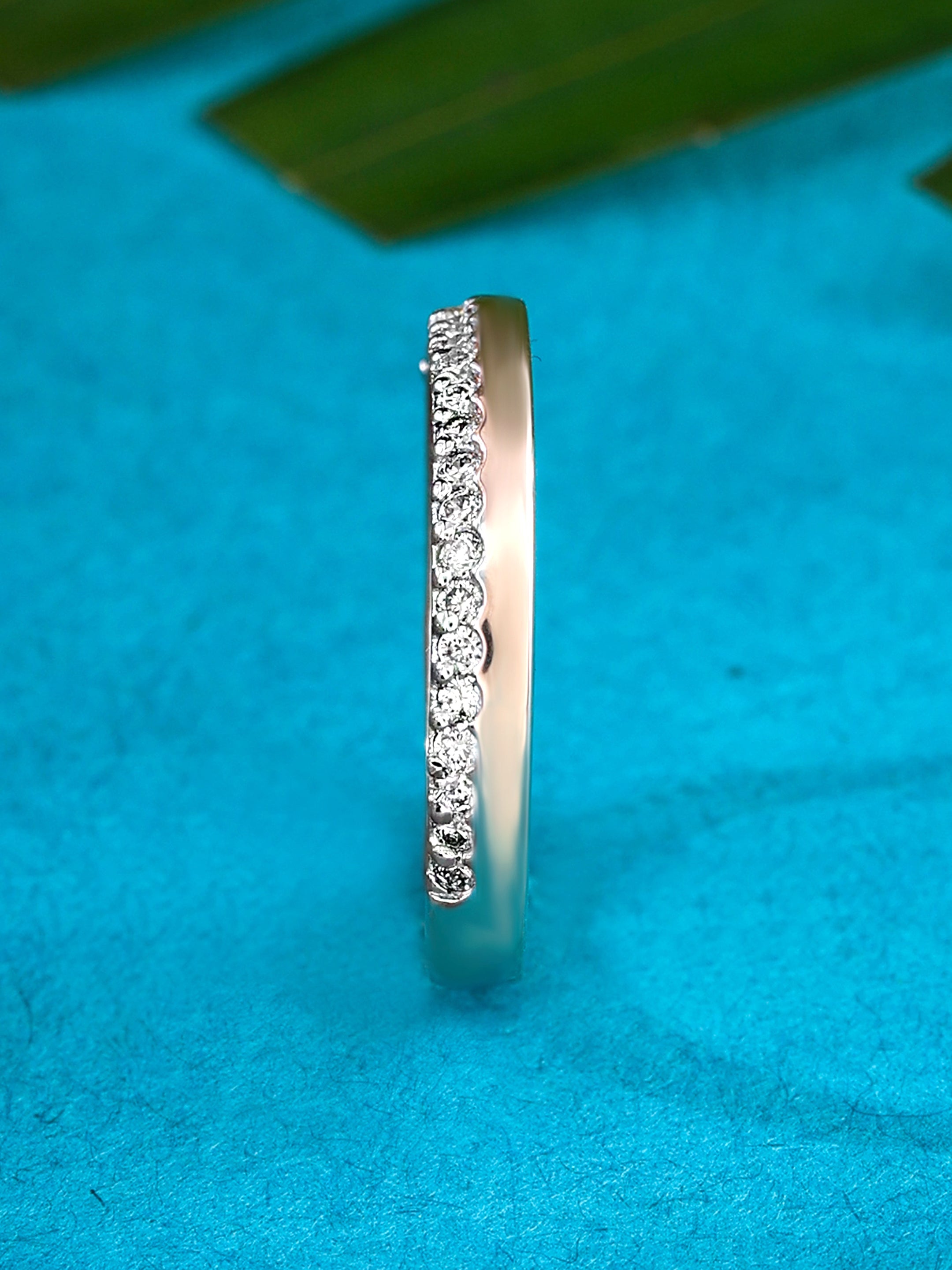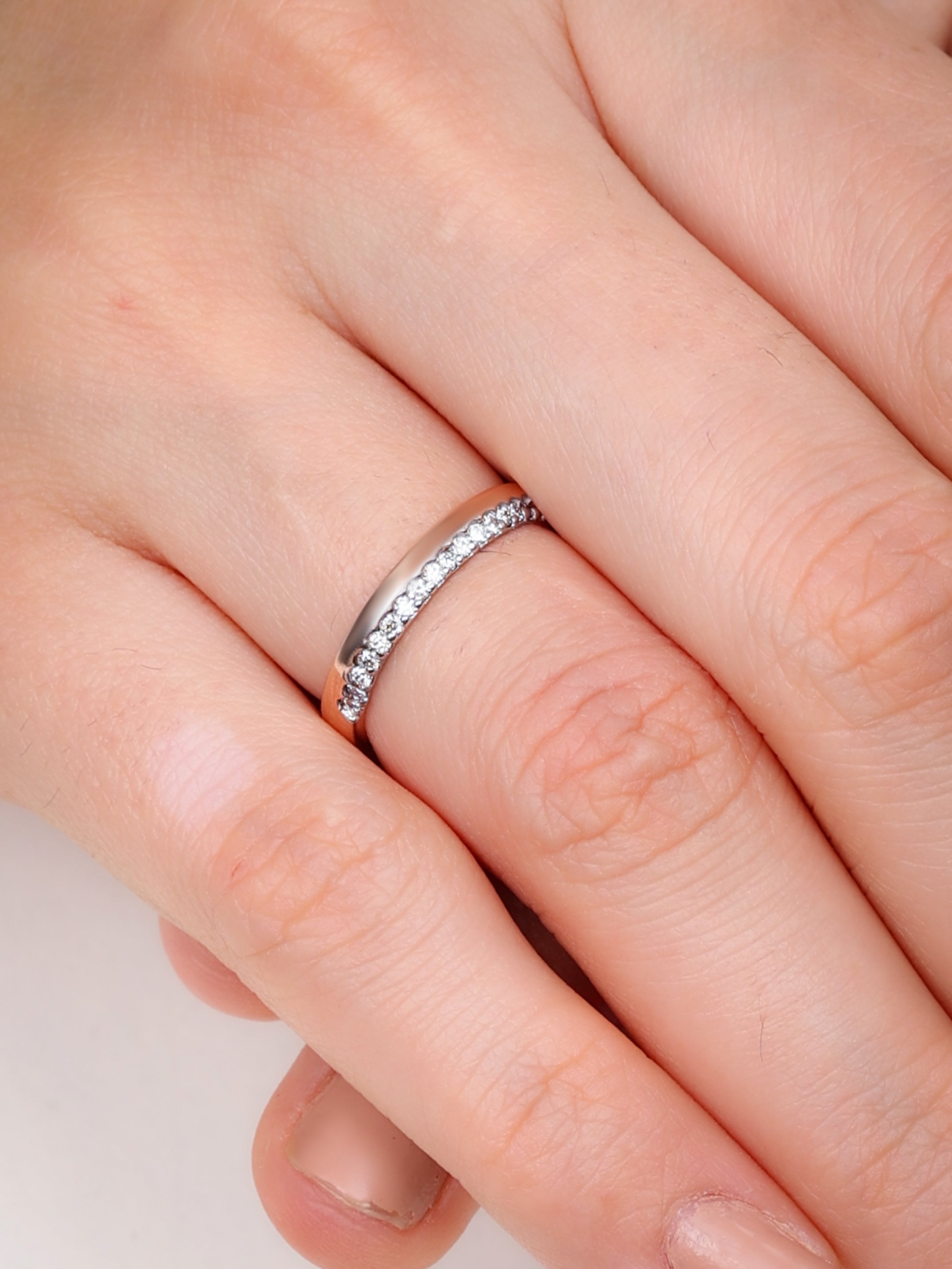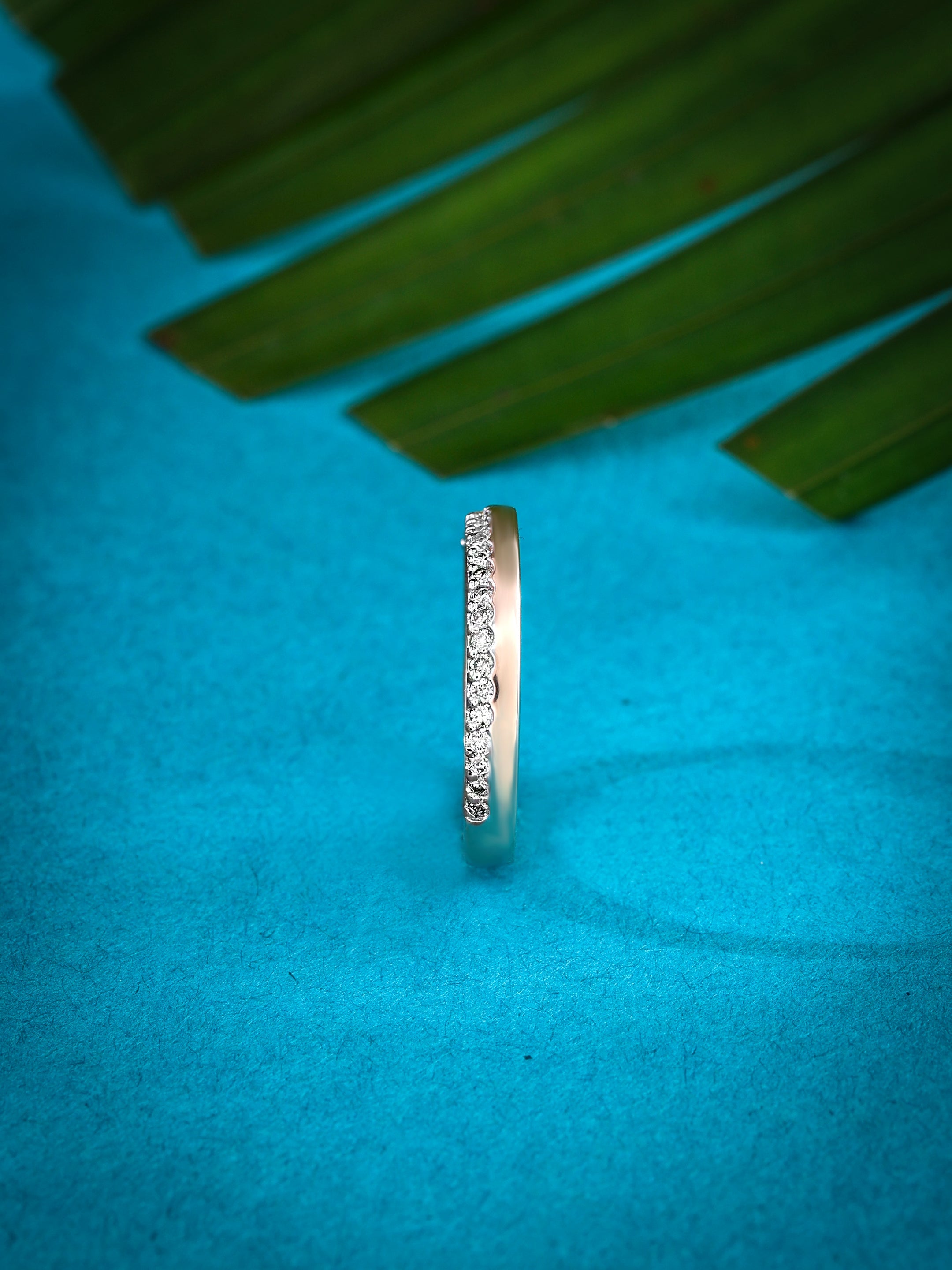 This exquisite ring features a delicate rose gold band adorned with a stunning row of brilliant white diamonds. The diamonds are meticulously set in a pavé setting, creating a continuous line of sparkle that gracefully wraps around the finger. The rose gold adds a touch of warmth and elegance, perfectly complementing the dazzling diamonds. Inside the band, a subtle engraving adds a personalized touch, making this ring a perfect symbol of everlasting love and sophistication. Ideal for special occasions or as a timeless piece of everyday jewelry, this ring embodies both modern elegance and classic charm.